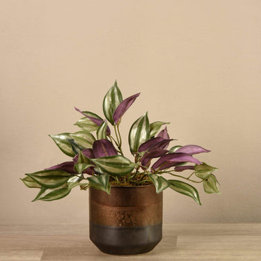 أضف لمسة من الرقة إلى طاولة القهوة أو رف الكتب مع نبتة الفانيليا الصناعية هذه. تبدو أوراقها المخططة باللونين الأخضر والخمري الباهت واقعية للغاية، وتضفي تباينًا جميلاً مع الأصيص ثنائي اللون بالرمادي والنحاسي.