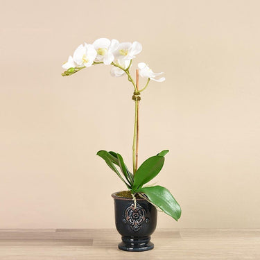 Give some exotic vibes to any living space with these beautiful artificial orchids. Hand-arranged by expert florists using real-touch technology, these flowers look and even feel like the real deal. Its glossy black pot adds a sophisticated touch.