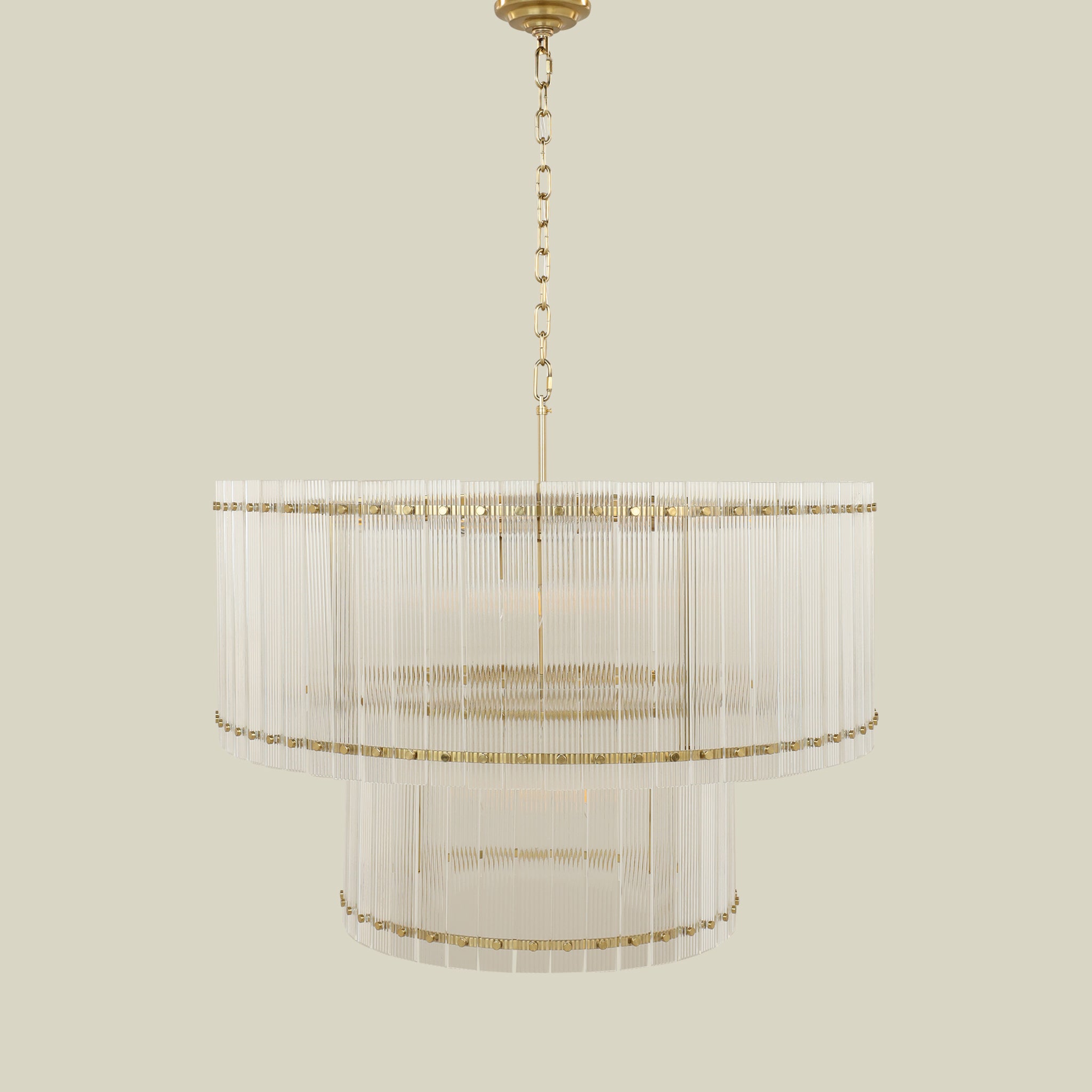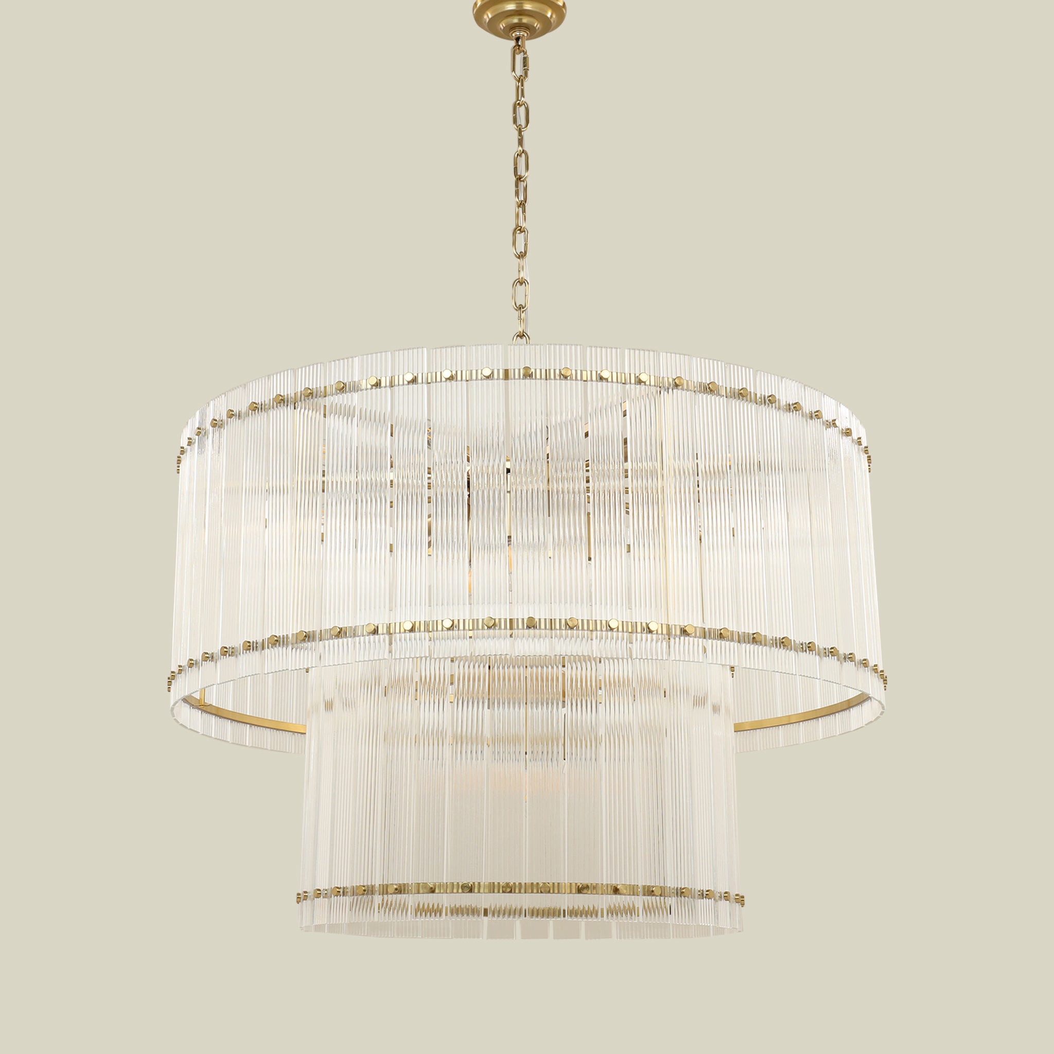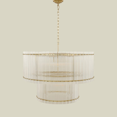 Featuring a harmonious blend of glass and metal in a warm gold finish, this fixture delivers both ambient illumination and architectural presence.