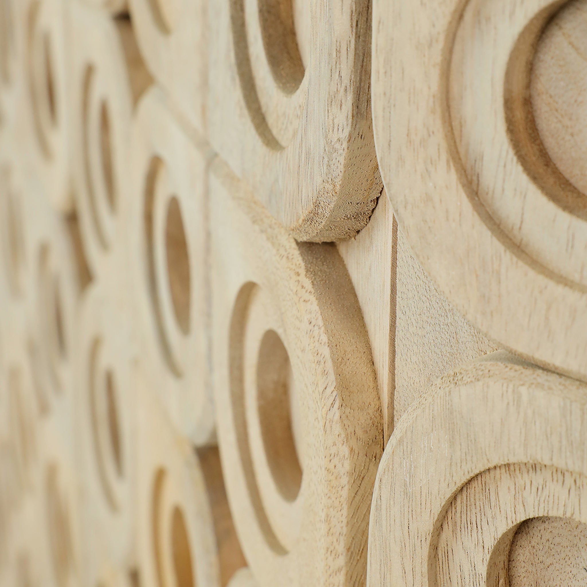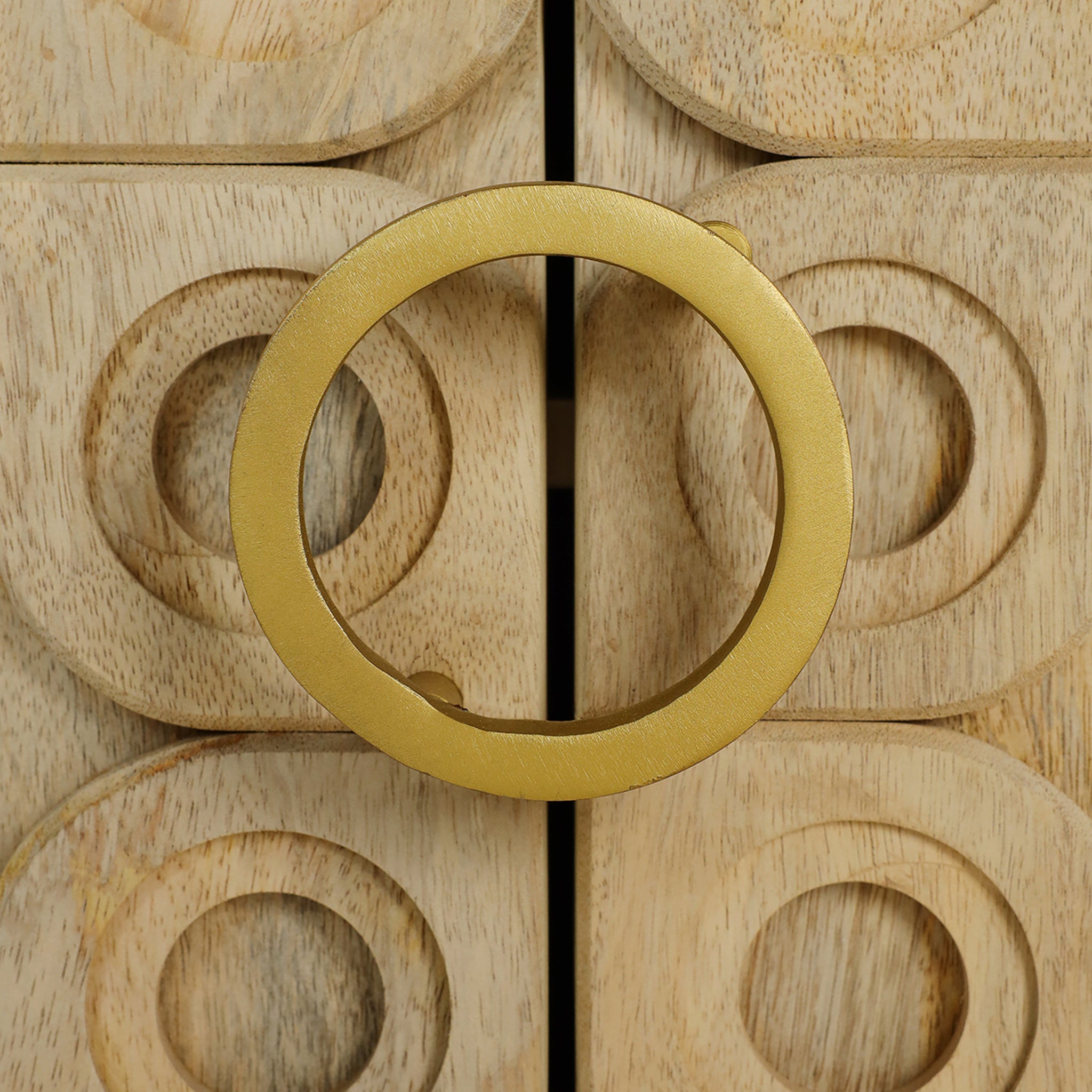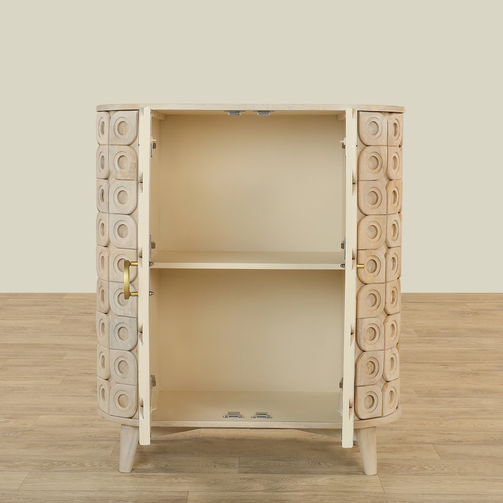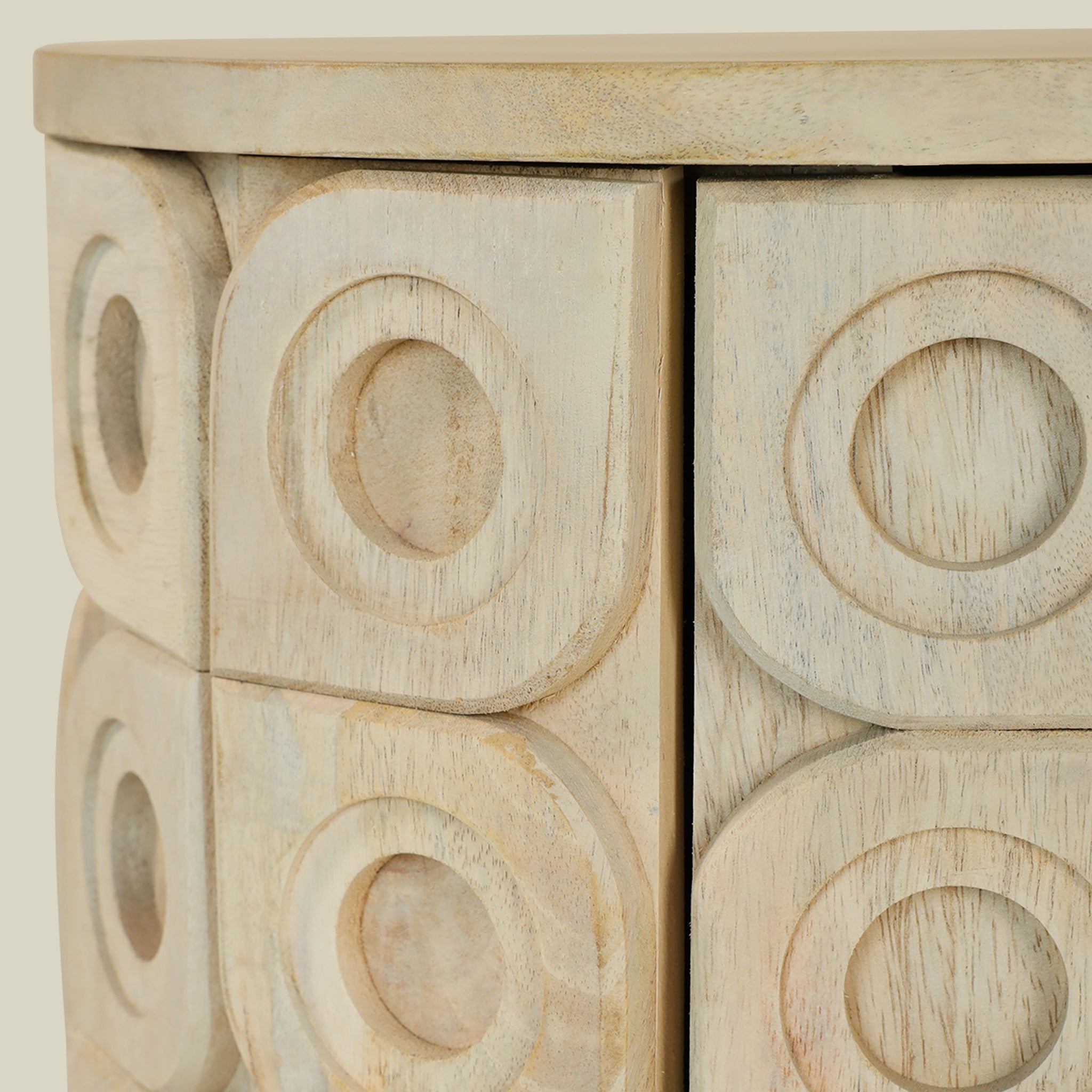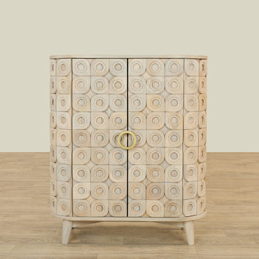 Elevate your living space with this sophisticated wooden sideboard, featuring a gracefully curved 2-door design adorned with intricately carved tiles.